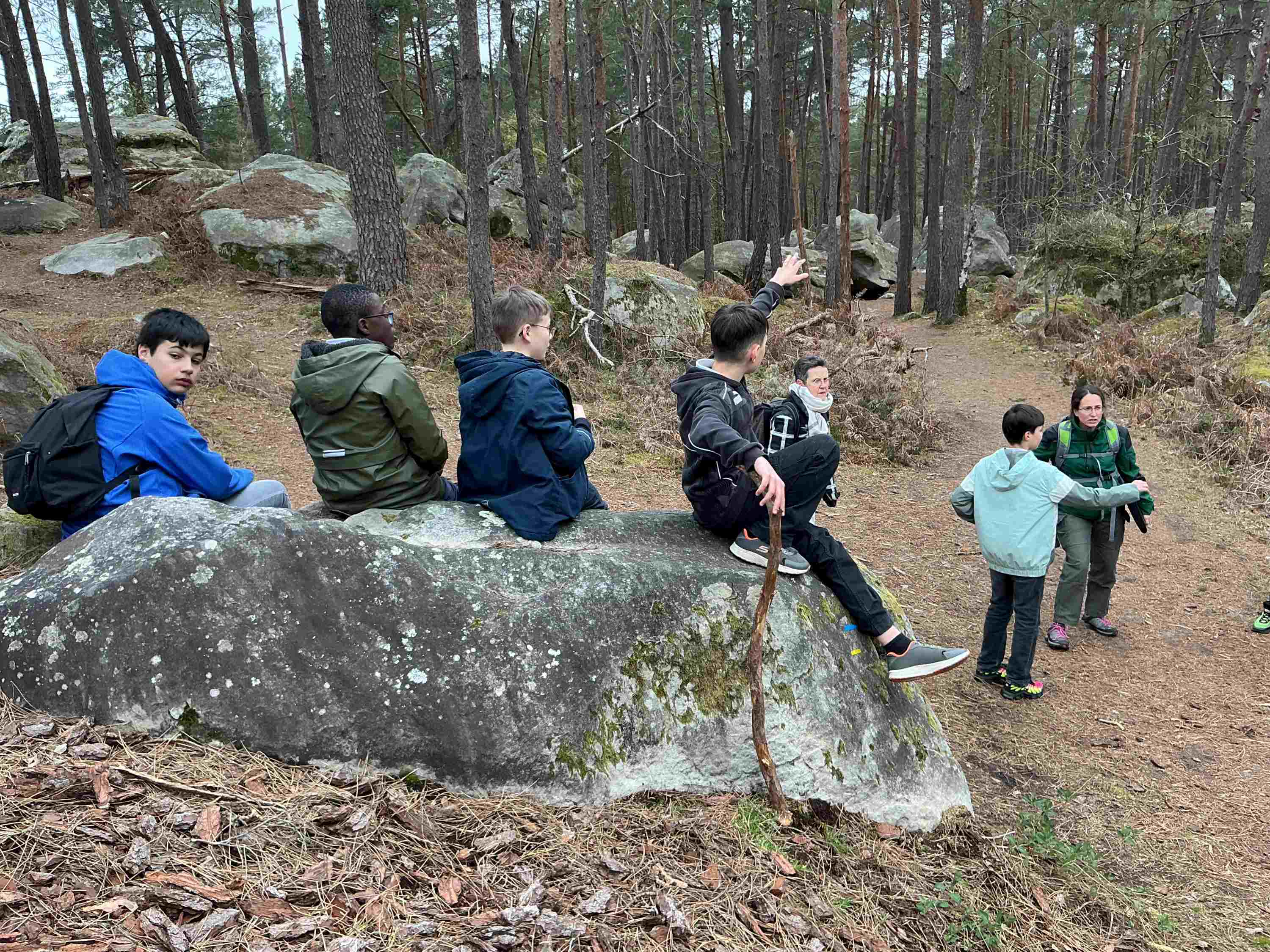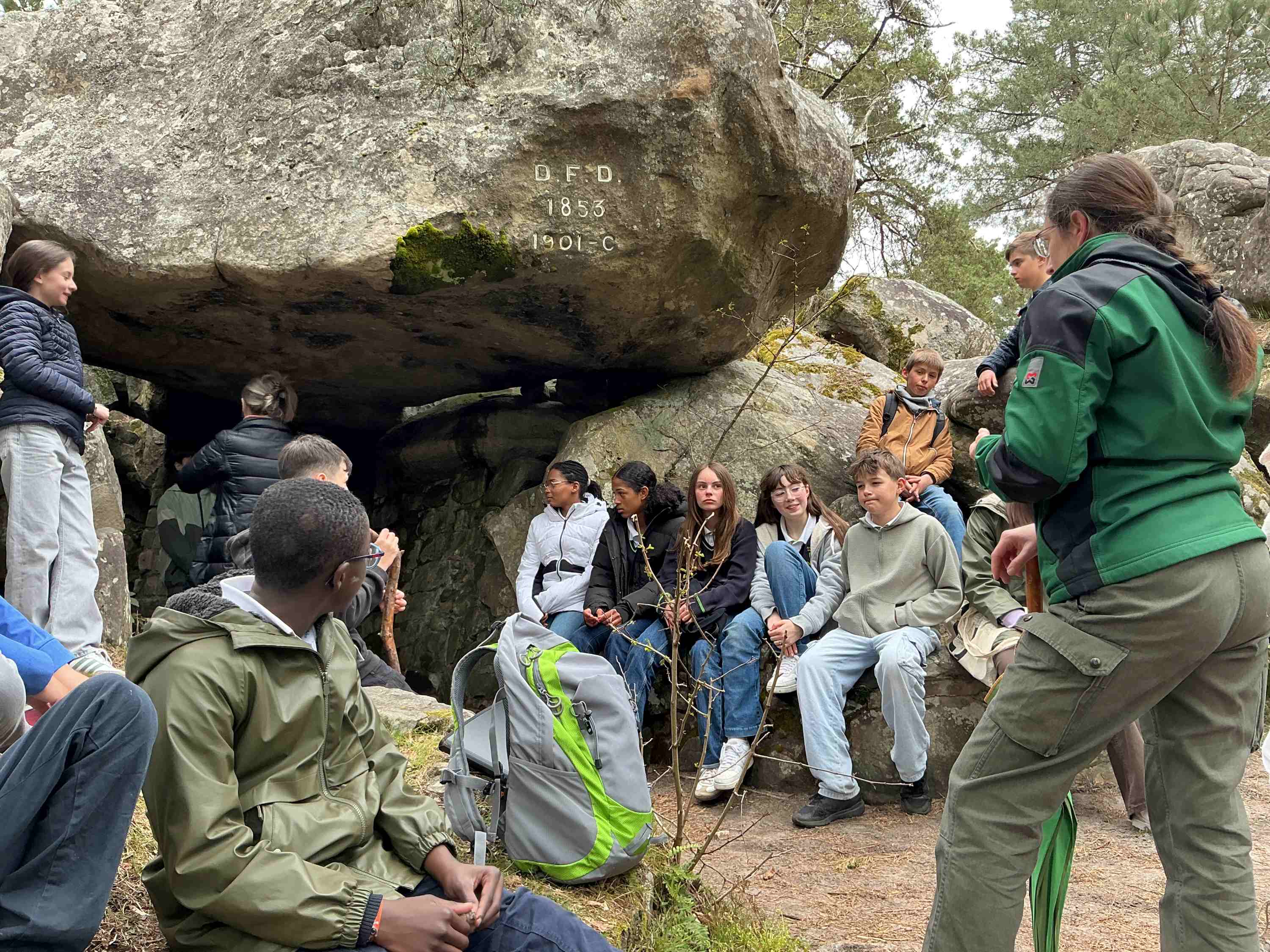 Mardi 31 mars, grâce à l’ONF, la classe de cinquième aide et soutien a pu profiter d’un temps clément pour découvrir ou redécouvrir notre belle forêt. Accompagnés de leurs professeurs d’arts-plastiques et de SVT ils se sont rendu à l’une des grottes de Charles-François Denecourt, célèbre bellifontain qui a permis de développer et de faire découvrir la richesse de ces paysages. Ils ont appris à mesurer l’âge d’un chêne en utilisant sa circonférence, à reconnaître les oiseaux grâce à leurs chants et à regarder la forêt autrement…